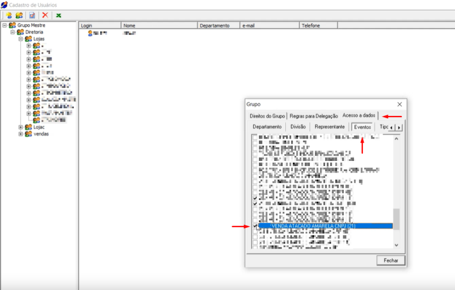 Acesse o "Cadastro de usuários" com um usuário que possua permissões de administrador, selecione o grupo em que o usuário, sem a permissão de acesso ao evento, esteja cadastrado: