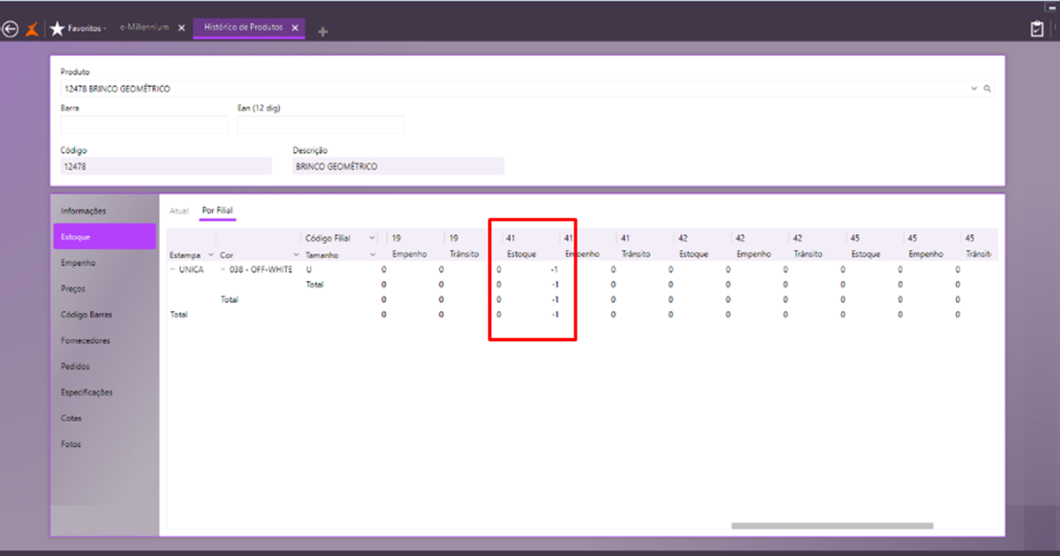 Veja este exemplo: temos a Filial 08 e a Filial 41. Na Filial 41, na Consulta de Estoque, temos a quantidade de -1.