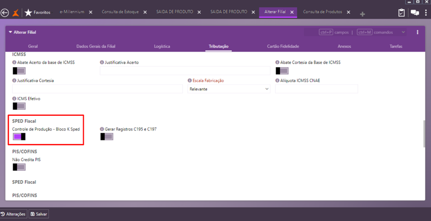Acesse o caminho Menu > Utilitários > Empresa > Filiais. Na aba Tributação, existe o parâmetro Controle de Produção – Bloco K Sped.