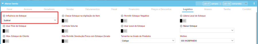 O evento precisa estar configurado para influenciar nos estoques das filiais. Como se trata de saída de uma filial e entrada em outra, é necessário configurar o evento para subtrair o estoque da filial que está enviando a mercadoria para a outra filial.