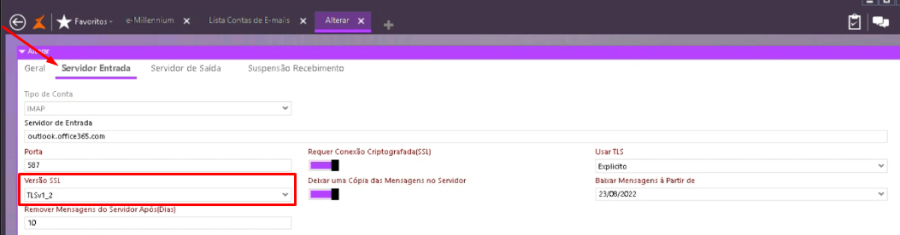 O sistema apresenta instabilidade no envio e recebimento de e-mail. Este erro ocorre devido a configuração na conta padrão conter o tipo de SSL diferente do esperado pelo provedor Office 365.