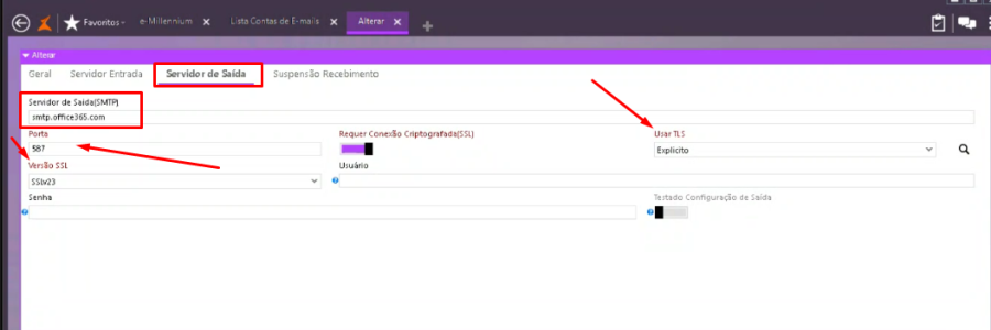 - Necessário acessar o ERP e alterar as configurações do e-mail padrão de acordo com necessidade do provedor, para este caso aplica-se apenas para office 365.