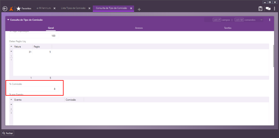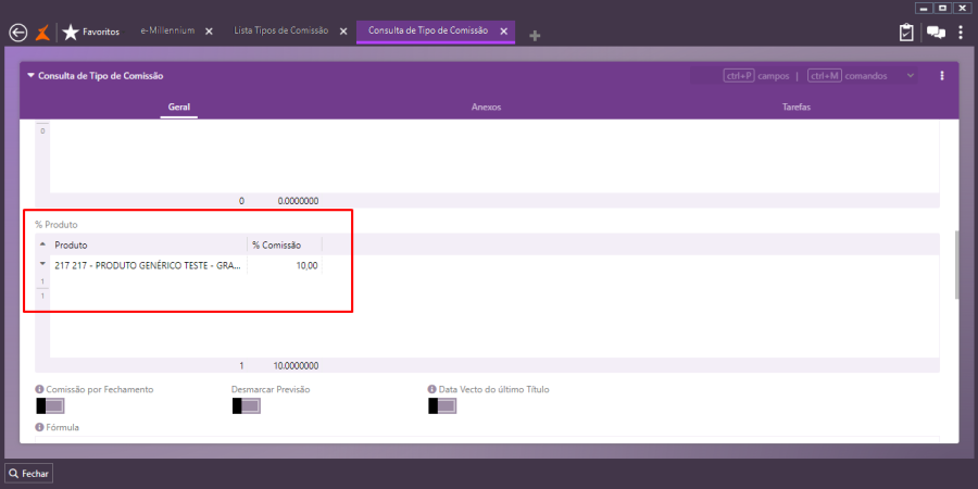 Ao consultar o tipo de comissão acima, podemos ver que sua porcentagem padrão é de 8%, e que há também uma porcentagem de comissão para o produto "217", sendo de 10%.