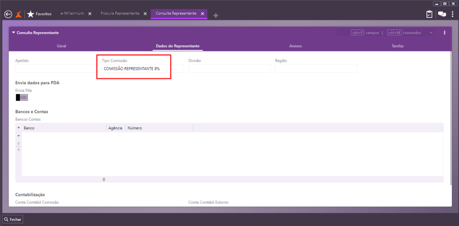 A venda do cenário presente na descrição acima estava sendo realizada com o representante "Representante Padrão", que por sua vez possui configurado em seu cadastro o tipo de comissão "Comissão Representante 8%".