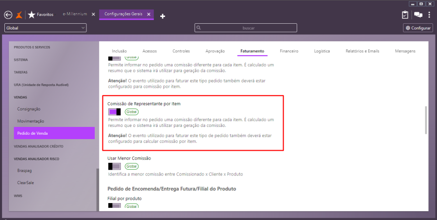 Para que o sistema priorize a comissão cadastrada para o item vendido, é necessário habilitar o parâmetro "Comissão de Representante por Item", localizado em "Menu/Utilitários/Administrador/Configurações Gerais/Pedido de Venda/aba: Faturamento".