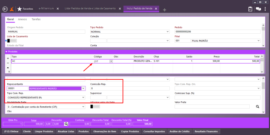 Agora vamos simular a inclusão de um pedido de venda do produto "217", com o representante "Representante Padrão" e com o parâmetro "Comissão de Representante por Item" desabilitado.