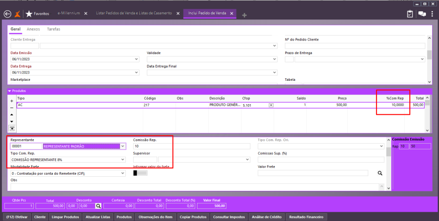 Perceba que mesmo havendo a comissão específica para o produto "217" de 10%, o sistema carregou a comissão de 8%.