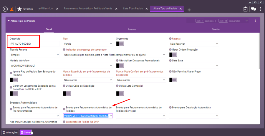 Para efetuar este ajuste acesso caminho "Menu/ Vendas/ Cadastro/ Tipos de pedido" selecione o tipo de pedido e clique sobre o botão "Alterar". Na tela de alteração, localize a opção "Evento para Faturamento Automático de Pedidos", selecione um evento e clique no botão "Salvar".