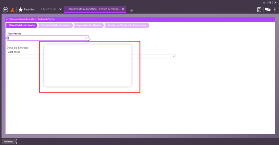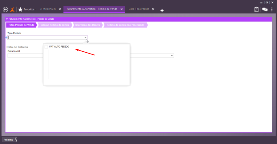 Após efetuado o ajuste acima, o tipo de pedido passará a ser exibido na tela Faturamento Automático Pedidos.