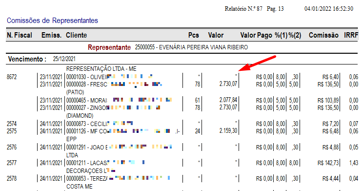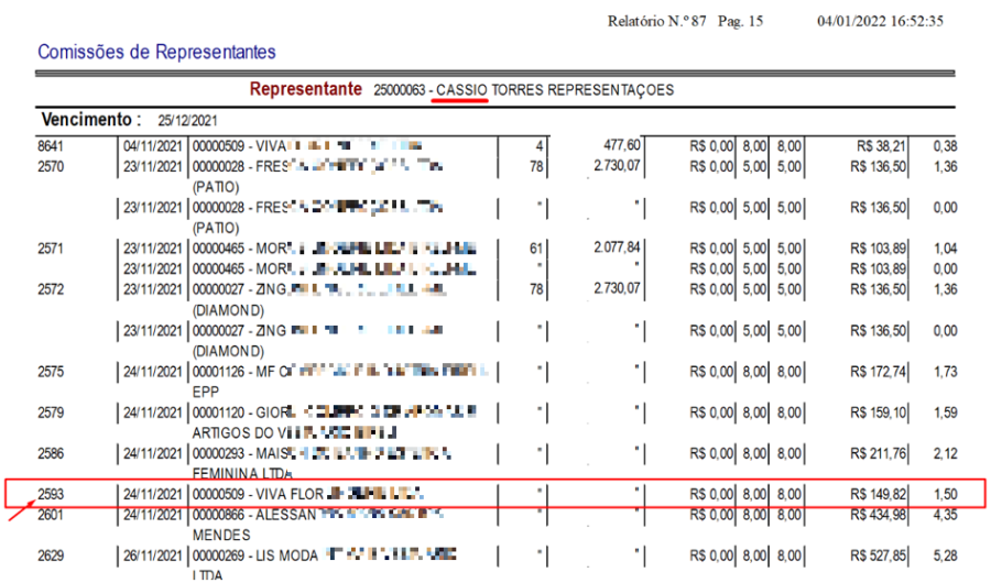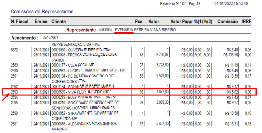 Para exemplificar o comportamento acima, neste mesmo relatório citado acima, podemos observar a venda 2593, que gerou comissão aos representantes Evenária e Cassio. A venda aparece no relatório nas comissões da Evenária, quando a venda aparece novamente no relatório nas comissões do Cassio, ela já é impressa com "(aspas) no lugar do valor, para evitar a duplicidade deste valor no Total do relatório.