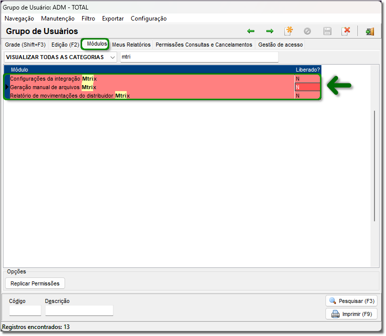 2. Localize o grupo de usuários desejado e clique na aba 'Módulos';