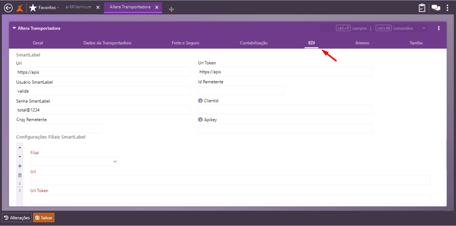 TMS\Cadastros\Transportadoras, na Guia EDI, preencha os campos para integração com a Total Express, para emissão da etiqueta Smart Label.