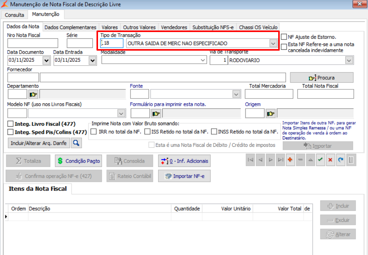 - Acessar o módulo de emissão de NF Descrição Livre.