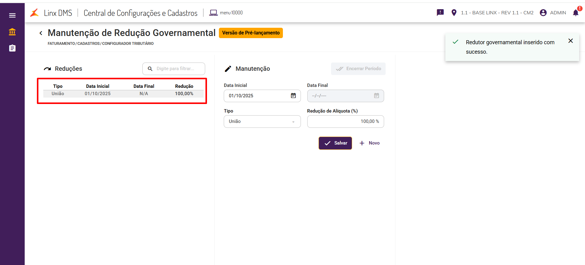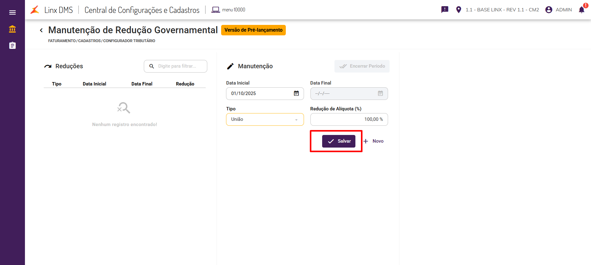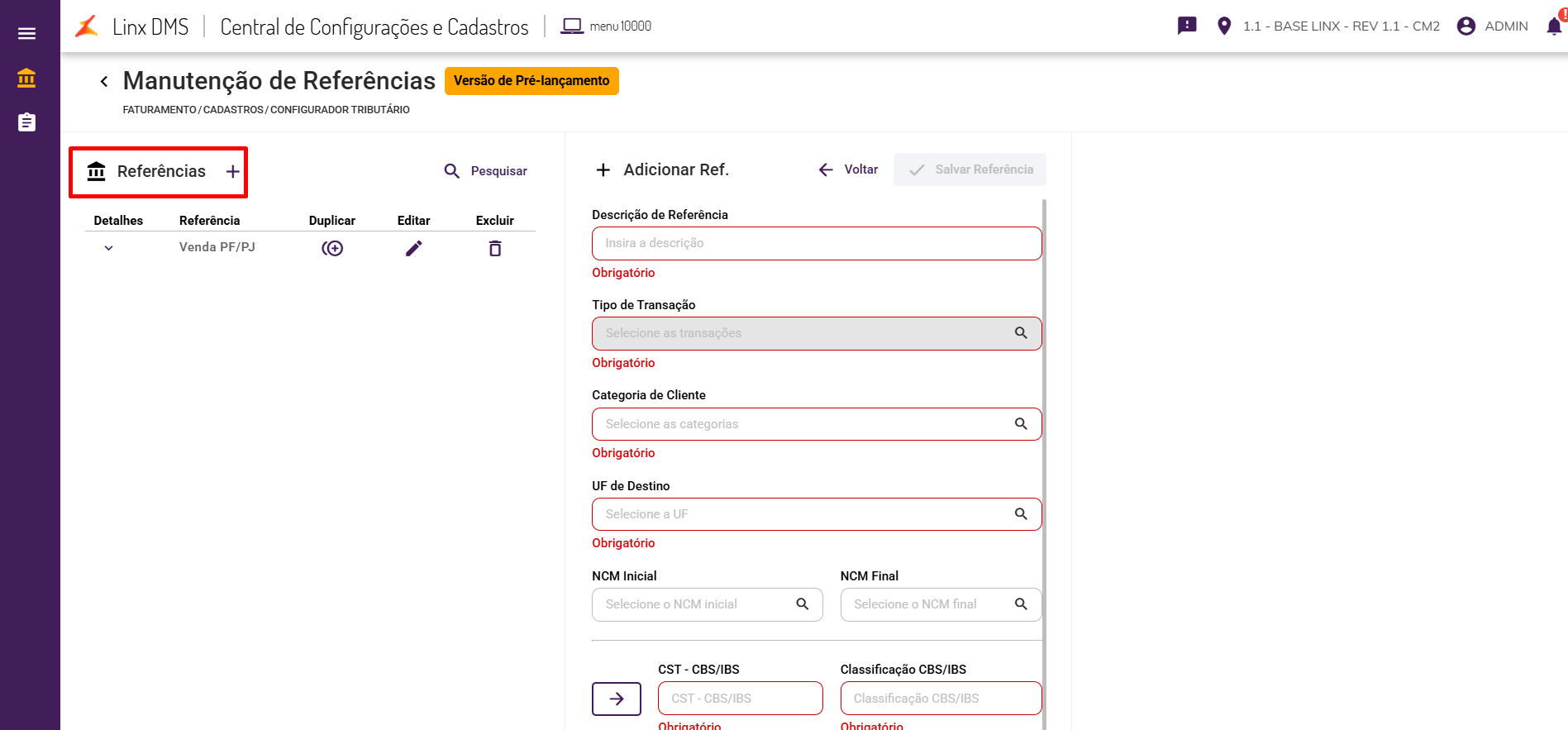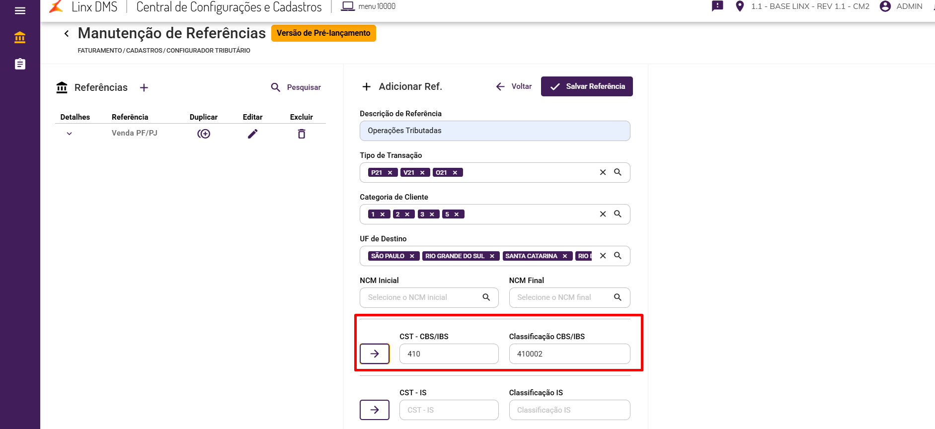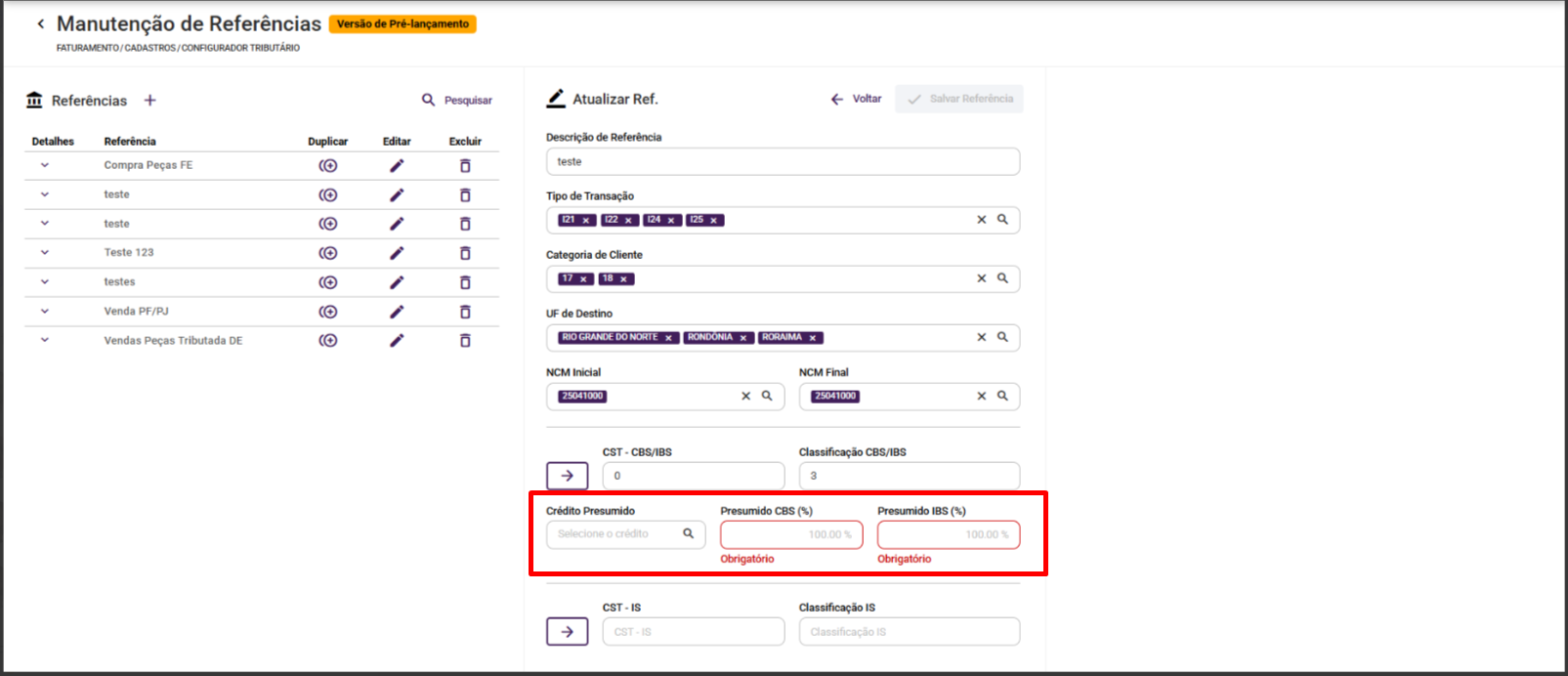 3. Acesse o Configurador Tributário e cadastre uma referencia para Transação com Crédito Presumido.