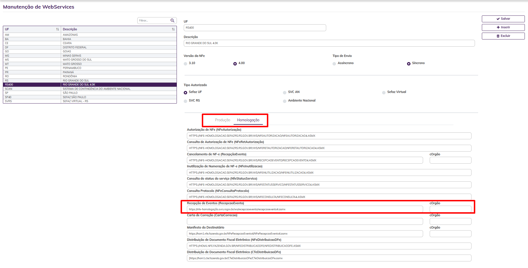 Necessário informar no Cadastro de Manutenção de Webservice da SEFAZ, o endereço no campo "Recepção de Eventos"