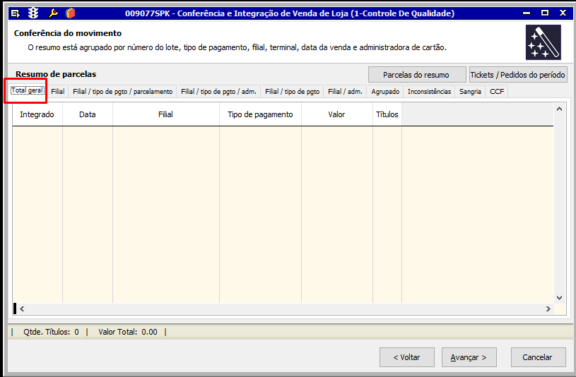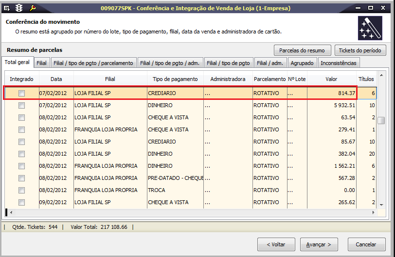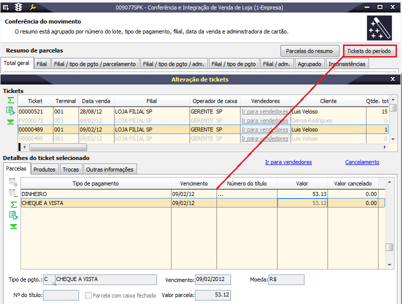Nesse momento os tickets serão desmembrados em parcelas, podendo conter inclusive os tipos de pagamentos que não foram selecionados para a conferência, uma vez que o ticket (venda) poderá conter várias formas de pagamento.