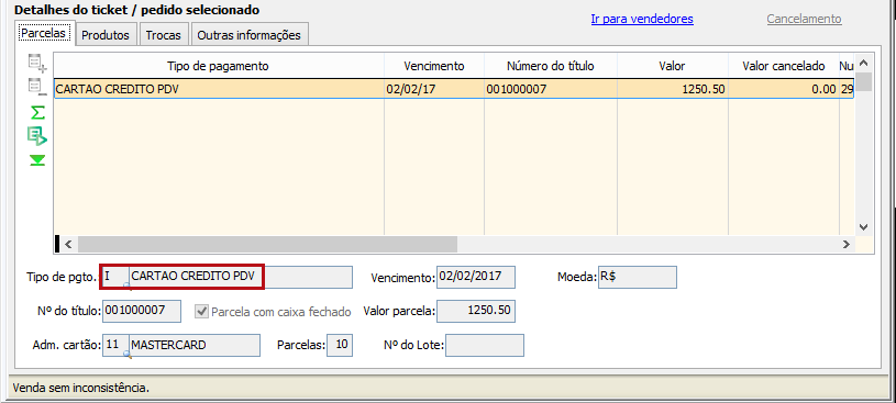 Se for necessário alterar dados das vendas, posicione o mouse no agrupamento e dê um duplo clique. Será exibida uma nova tela com os detalhes das parcelas, cujos valores não estão corretos, conforme exemplo. Para concretizar as alterações necessárias, clique em Localizar Ticket.