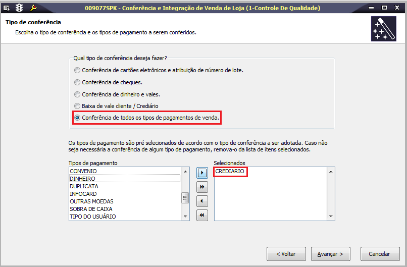 Marque o tipo de conferência e selecione, com o uso das setas, os tipos de pagamentos para a conferência. Veja um exemplo: