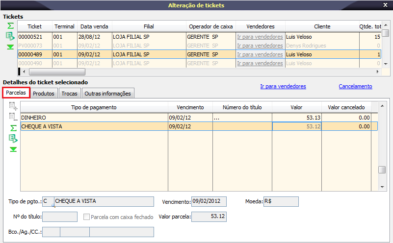 Será aberta a tela Alteração de Tickets. Selecione a venda a ser alterada para que as informações correspondentes a ela sejam exibidas na guia Parcelas em Detalhes do ticket selecionado.