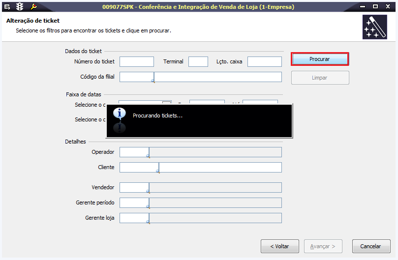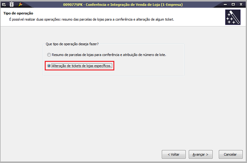 A seguir uma simulação com a segunda opção apresentada na tela, para alteração de tickets. Selecione-a e clique em Avançar: