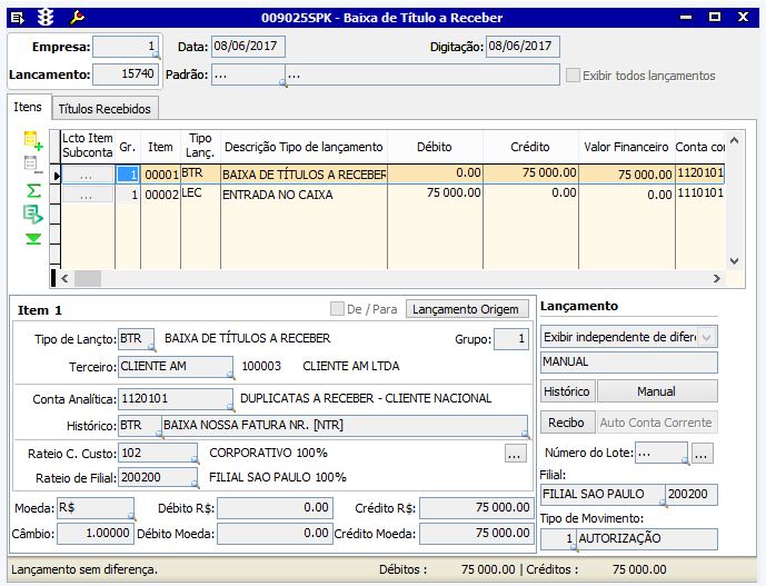 - Manual, com a seleção dos títulos e inclusão dos lançamentos e valores pelo operador.