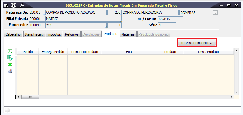 6. Na página Produtos, acessar o botão Processa Romaneios.