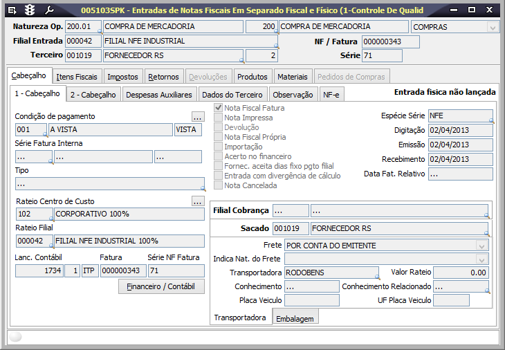 Verifique, a seguir, as principais informações da tela de Entrada de NF em Separado Fiscal e Físico.