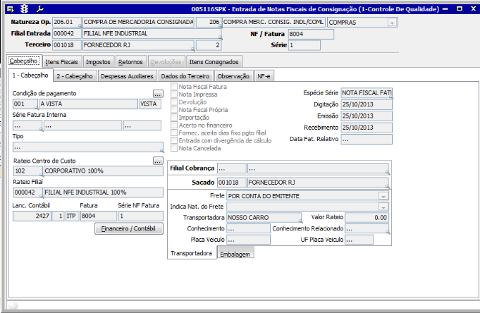 Selecione nesta guia os itens consignados que serão recebidos pela empresa.