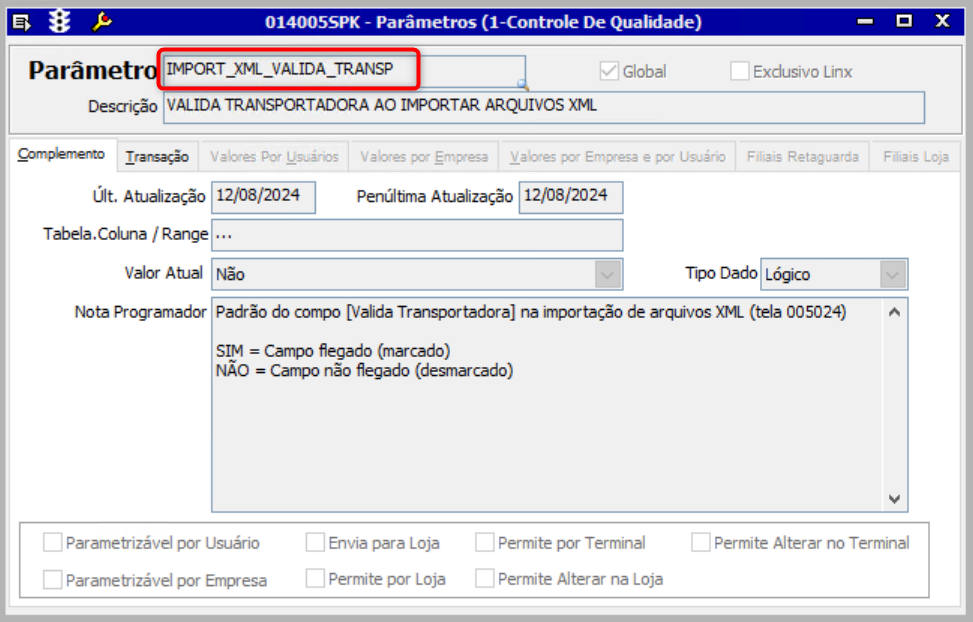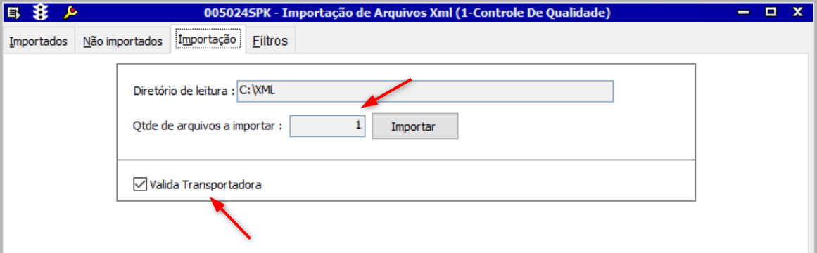 O parâmetro IMPORT_XML_valida_transp irá deterrminar o comportamento da tela