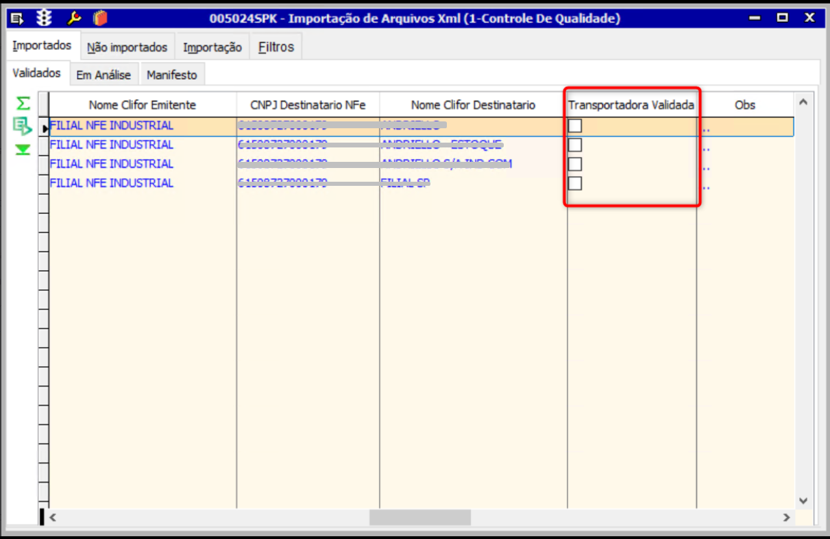 Para que o cliente consiga identificar quais xmls foram importados com validação ou não da transportadora , foi acrescentada uma nova coluna na grade: Transportadora Validada - ela busca informação gravada na tabela NFE_XML e indica em cada registro consultado se ocorreu ou não a validação na importação do XML.