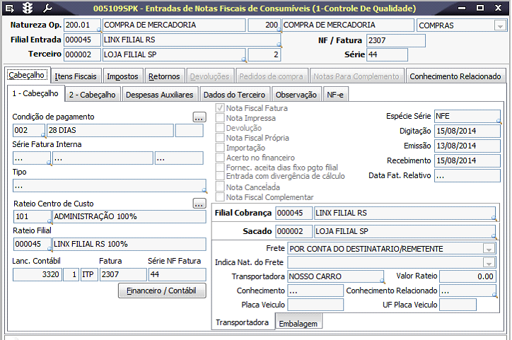 2. Informe os dados do Cabeçalho: Filial de Entrada; Fornecedor; Quatro últimos dígitos da Nota Fiscal; Série e Espécie Série.