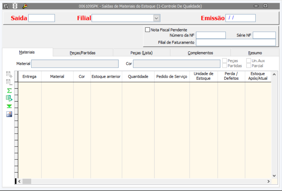 | Saída | Campo que identifica o tipo de movimentação de saída de materiais do estoque. Pode representar diferentes tipos de saídas, como venda, transferência, devolução, entre outros. | Filial | Refere-se à unidade da empresa que está realizando a operação de saída de materiais. Este campo especifica a filial responsável pela transação. | Emissão | Data em que a operação de saída de materiais foi registrada ou emitida. Geralmente, é a data de criação do documento de saída. | Flag (Nota Fiscal Pendente) | Indica se há uma Nota Fiscal (NF) pendente para a operação de saída. Pode ser um campo booleano ou checkbox, onde marcado indica pendência e desmarcado indica ausência de pendência. | Número da NF | Campo para registro do número da Nota Fiscal associada à saída de materiais. É um identificador único para a NF dentro da filial. | Série NF | Identifica a série da Nota Fiscal. As séries são usadas para diferenciar conjuntos de NFs dentro da mesma empresa e podem variar conforme o tipo de operação ou o modelo de NF. | Filial de Faturamento | Campo que especifica a filial responsável pelo faturamento da operação. Pode ser diferente da filial que realizou a saída física dos materiais. |