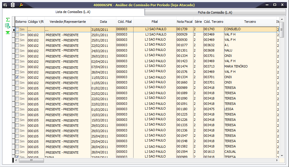 A tela 400006 - Análise de Comissão por Período permite que sejam pesquisadas as comissões por meio de filtros como data (definido pelo usuário), nome do Vendedor/ Representante, Código da Filial e Terceiro, definidos na guia Ficha da Comissão (L.A).