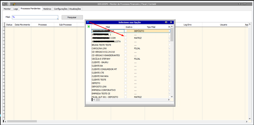 - Na aba Processos Pendentes ao clicar com o botão direito no campo Filial é aberto uma caixa de seleção de filiais.