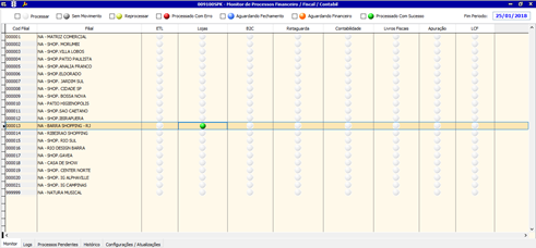 Os status são exibidos e ordenados pelo código da filial. A tela sempre será iniciada com a data do dia anterior no campo Fim do Período e os dados serão atualizados automaticamente de acordo com o valor determinado pelo parâmetro FFC_MONITOR_TEMPO. A data inicial da consulta será a data do último fechamento contábil de cada filial e a data final que está indicada no campo Fim do Período.