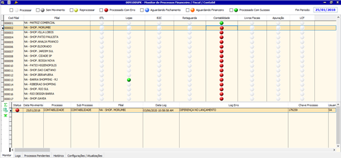Quando existir algum processo com inconsistência, clique sobre a filial para destacar as inconsistências em uma guia conforme imagem abaixo: