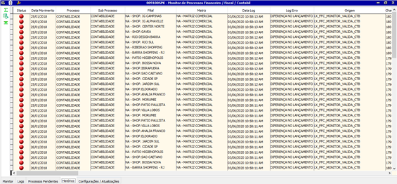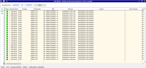 Na guia LOGs é possível visualizar o status de cada sub processo. Os processos estão detalhados e ordenados pela data do movimento e filial.