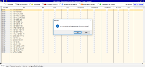Na guia Configuração / Atualização são registrado quais processos são executados para cada filial.