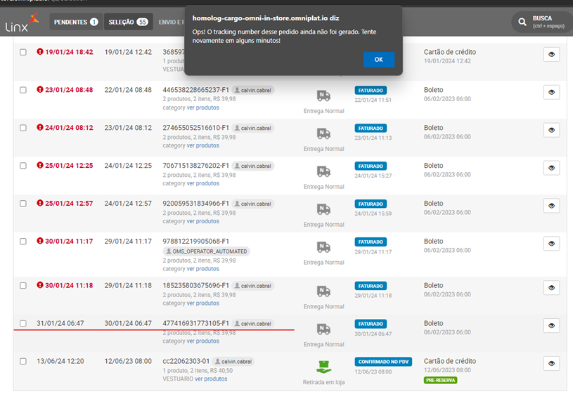 2° Lista de preparação de entrega – Na seleção de 1 ou mais pedidos, caso algum dos pedidos seja de um transportador citado na configuração do cliente e ele atenda as regras de contenção, um popup será apresentado em tela informando que o trackingNumber do pedido ainda não foi gerado. Sendo assim o agrupamento de pedidos para preparação de entrega não poderá possuir nenhum pedido com erro.