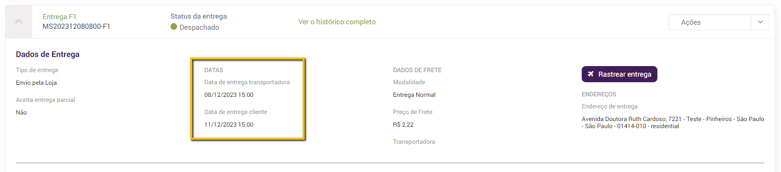 Figura 1: Datas estimadas de entrega ao cliente e transportadora em dados da entrega no cockpit