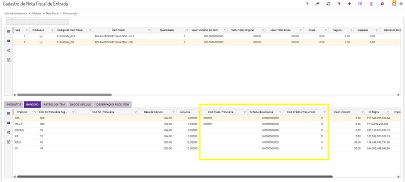 É obrigatório preencher o campo "Código Class Tributária — 000001". O código a ser utilizado pode variar, pois depende do cenário fiscal de cada cliente.