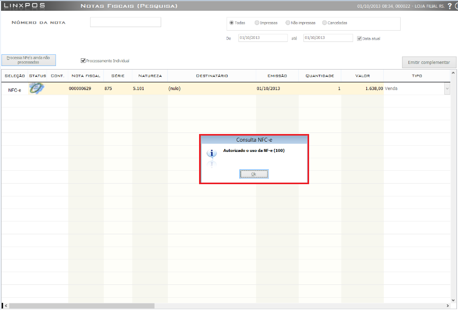 7. Consequentemente o sistema apresentará o retorno da SEFAZ, chamado também de "Autorização de Uso":