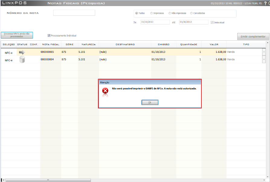 Para impressão do DANFE, primeiramente é necessário a autorização da SEFAZ. Todavia, ao tentar imprimir sem o retorno, o sistema exibirá o seguinte alerta: Não será possível imprimir o DANFE de NFC-e. A nota não está autorizada.