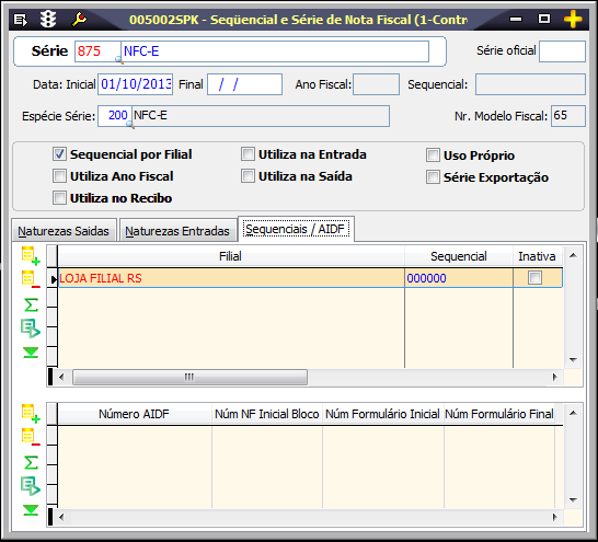 005002 - Sequencial de Série e Nota FiscalCadastre uma série para emissão de NFC-e e associe a espécie série cadastrada anteriormente no campo Espécie Série. Automaticamente, a nova série estará vinculada ao número modelo fiscal 65. Na guia Sequenciais/AIDF será necessário cadastrar um sequencial por filial para que a emissão de notas fiscais em contingência funcione adequadamente. |