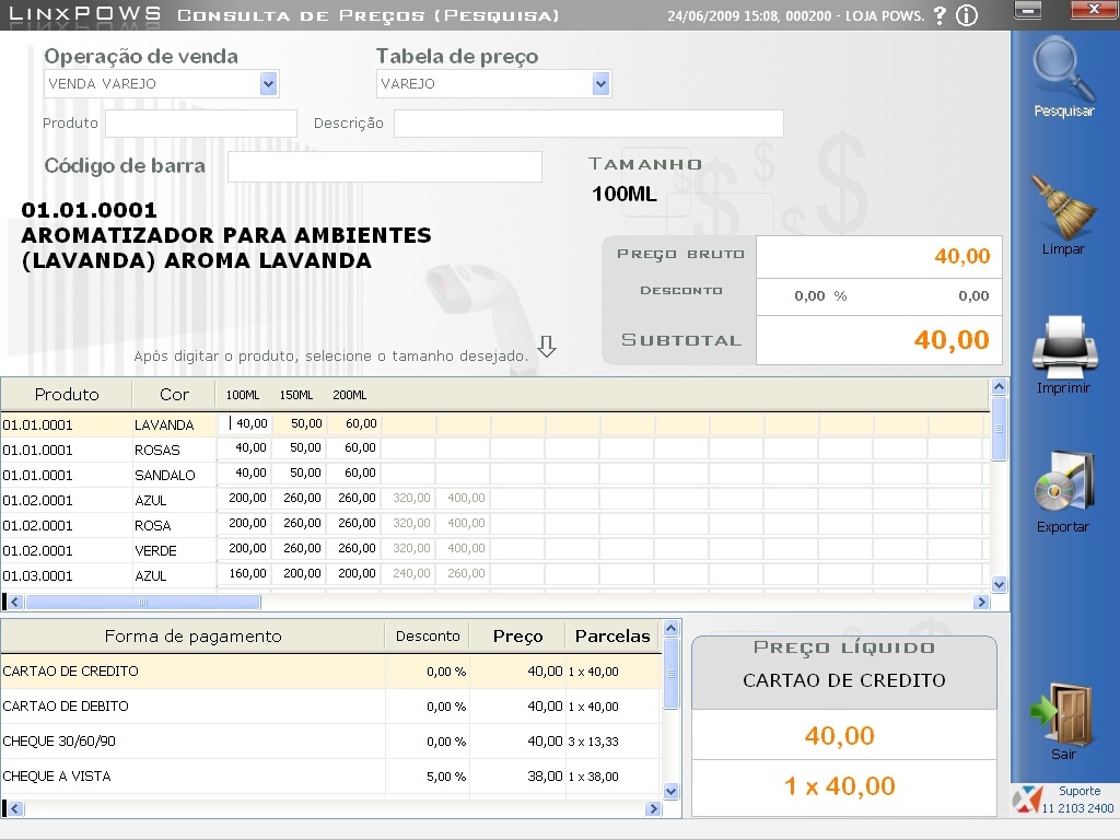 A consulta de preços apresenta a grade completa dos produtos (cor e tamanho) e as formas de pagamento disponíveis para os produtos, preço bruto, descontos e preço líquido.