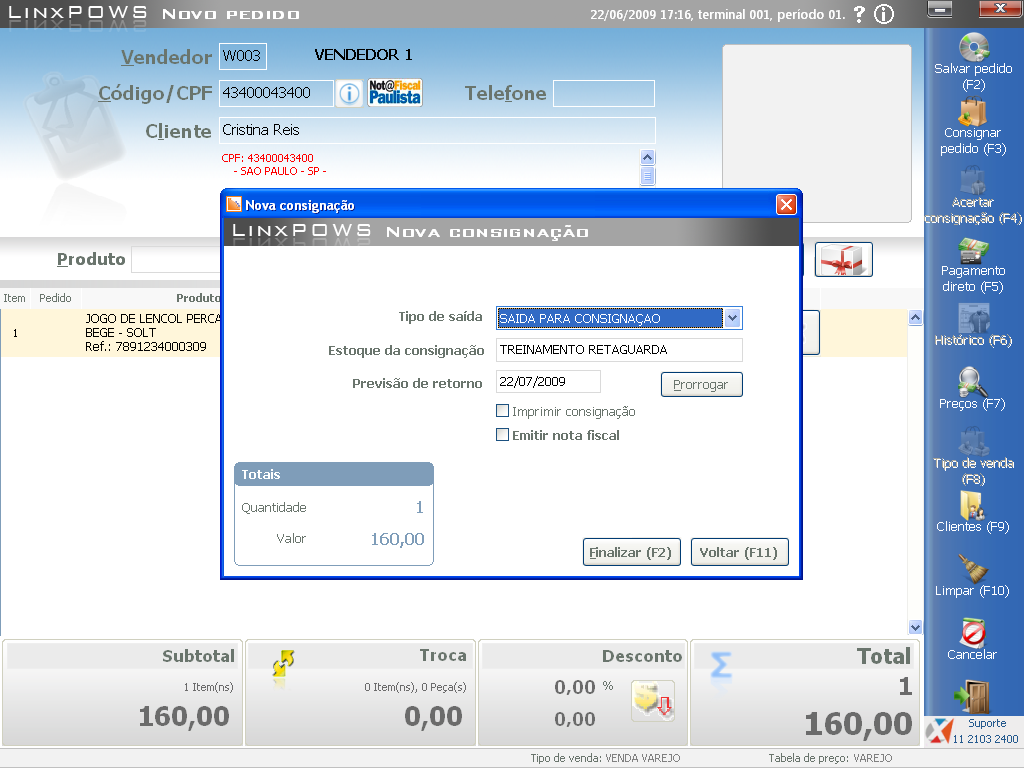 Nesta opção é possível realizar consignação de produtos, bem como o tratar as formas de retorno da consignação.