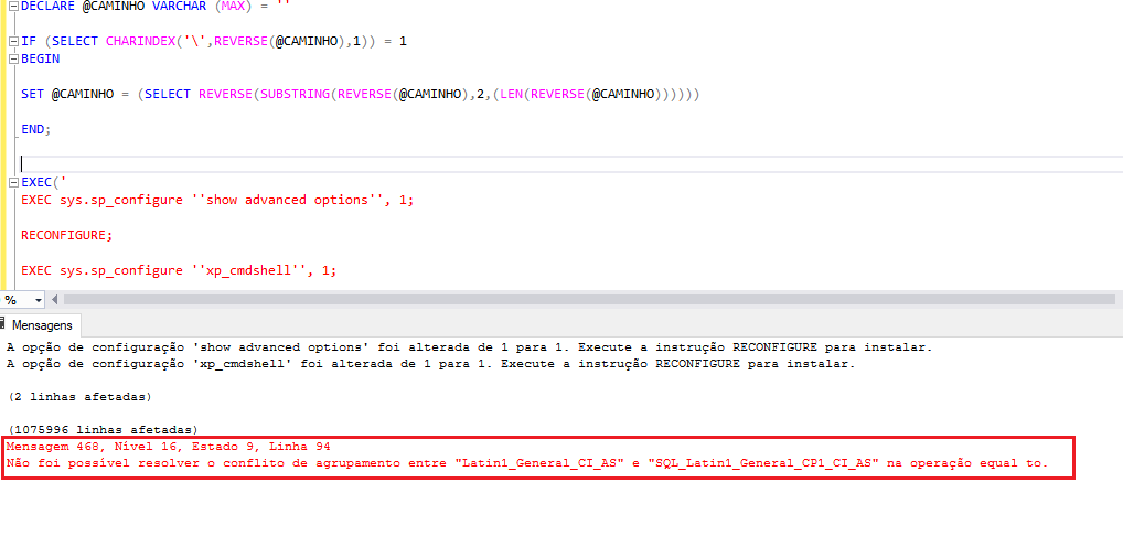 Em alguns casos, ao realizar a instalação do CAD CEP, é possível que o SQL indique a mensagem de conflito destacada abaixo: