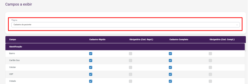 3) No campo de seleção Página selecionar a opção "Módulo de Oftalmologia".