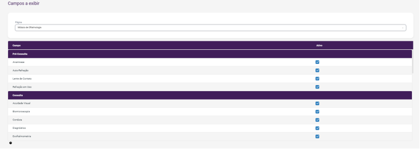 4) Após a seleção da Página, são carregados os exames e opções de registro de dados clínicos oftalmológicos para serem marcados conforme a especialização e a rotina de cada médico. Essa personalização garante que cada profissional tenha acesso apenas aos recursos pertinentes à sua prática.