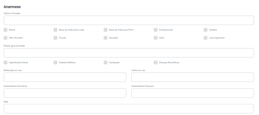 - Refração em Uso: Dados sobre o grau das lentes atualmente utilizadas pelo paciente;